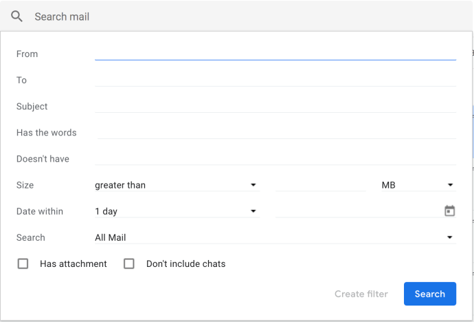 Вам не нужно использовать RegEx, если вы не хотите. Вы можете использовать более простые операторы поиска в Gmail, чтобы найти то, что вы ищете, если хотите. В представлении «Входящие» выберите серую стрелку рядом с кнопкой поиска, чтобы открыть окно полного поиска. Отсюда вы можете использовать операторы в Gmail.