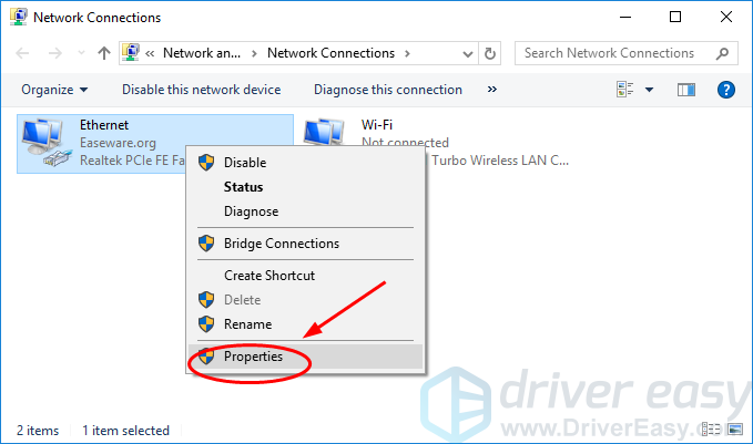 - Щелкните правой кнопкой мыши на Подключение по локальной сети, Ethernet или же Wi-Fi в соответствии с вашей Windows. Затем нажмите свойства.|