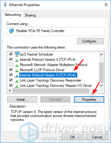 - Нажмите Интернет-протокол версии 6 (TCP / IPv6), затем свойства.