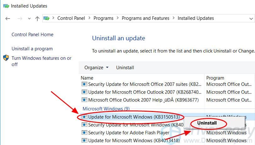 4) Найти последнюю Обновление для Microsoft Windows, щелкните правой кнопкой мыши это обновление и выберите Удалить.
