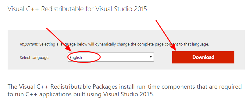 1) Перейдите на страницу загрузки распространяемого Visual C ++ для Visual Studio 2015.