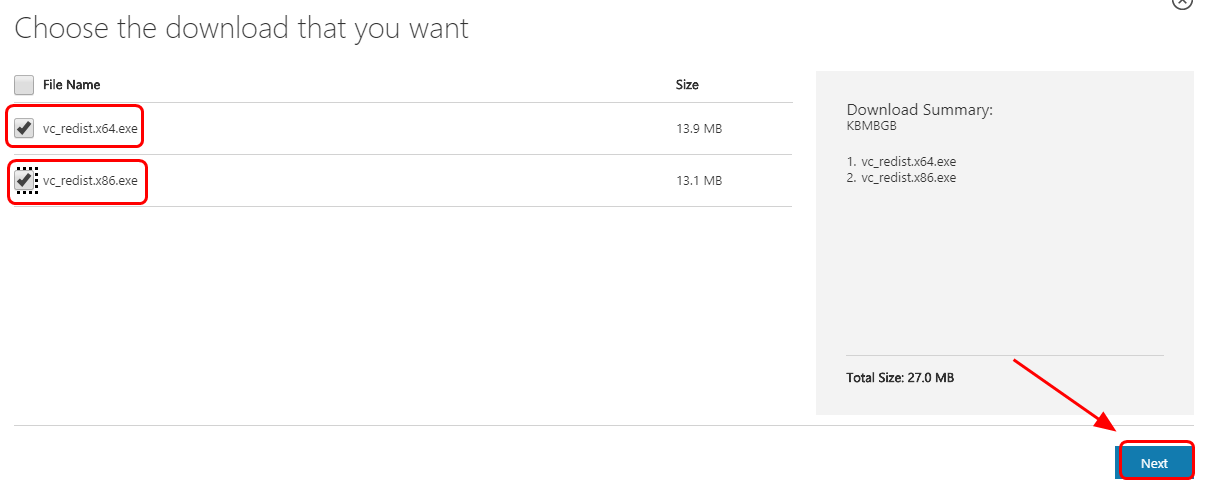 3) Выберите оба vc_redist.x64.exe а также vc_redist.x86.exe, затем нажмите следующий.