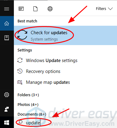 1) Тип Обновить в Поиск коробка в Начните кнопка на рабочем столе. В результате поиска выберите Проверьте за Обновить в настройки (или же Проверить обновления в Панель управления) чтобы открыть его.