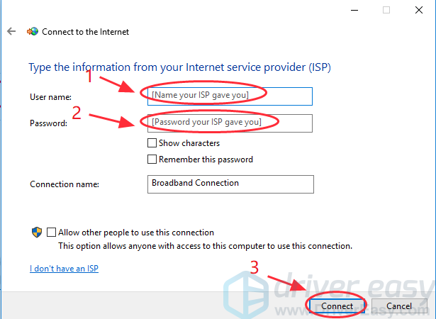 6) Введите имя пользователя а также пароль поставщиком услуг Интернета (ISP) и нажмите соединять.