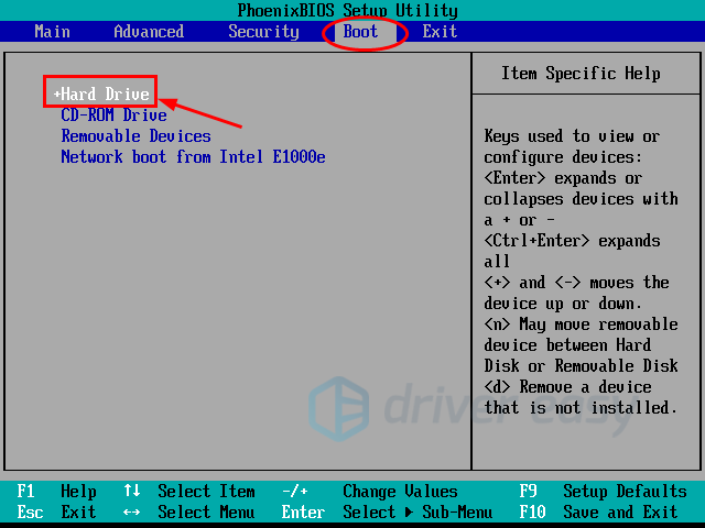 2. нажмите клавиши со стрелками вправо на клавиатуре, пока ботинок вкладка открыта. Затем переместите Жесткий диск наверх списка порядка загрузки. (Вы можете прочитать инструкцию вашего BIOS, чтобы узнать, как перемещать элемент в списке.)