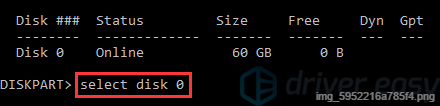 3. В списке дисков введите «выберите диск 0 ( «0Здесь относится к номеру диска где вы установили свою систему) »И нажмите Войти.