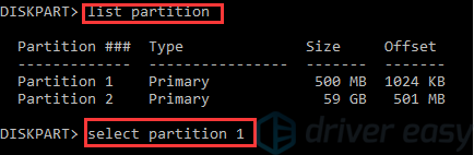 4. Тип «раздел спискаИ нажмите Войти. Затем в списке разделов на этом диске введите «выберите раздел 1 ( «1Здесь относится к числу Системный зарезервированный раздел, где находится загрузчик. Обычно это меньший основной раздел) »и нажмите Войти.
