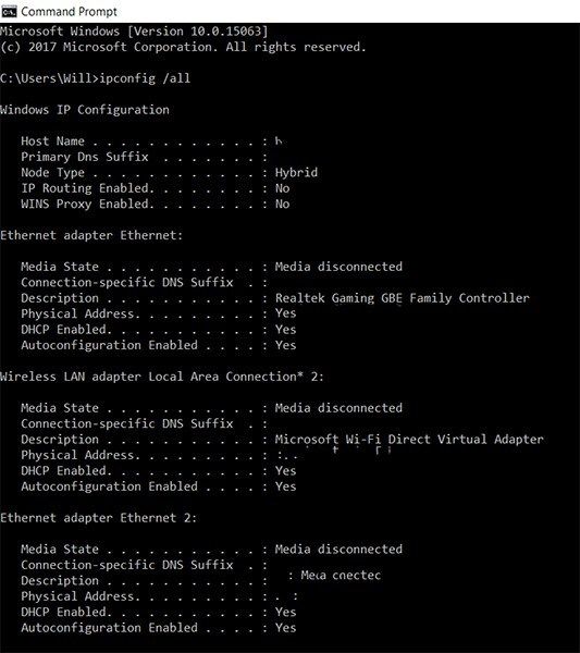 После того, как вы загрузили командную строку на свой компьютер, введите следующую фразу, как написано, без кавычек: ‘ipconfig / all«. После ввода этой фразы нажмите клавишу «Ввод» или «Ввод» на своем компьютере. Это загрузит длинный список информации внутри командной строки, включая информацию об имени хоста вашего ПК, состояниях ваших адаптеров Ethernet и беспроводной локальной сети (если применимо), а также дополнительную информацию о подключении для соединений Ethernet и локальной сети, а также Информация о подключении Bluetooth вашего устройства. Это много, чтобы принять, и большая часть этого в основном бредовая (как вы можете видеть на нашем скриншоте выше. Тем не менее, мы будем искать одну конкретную информацию. В разделе «Ethernet-адаптер Ethernet» ищите Адрес IPv4. Большинство электроники по-прежнему используют адреса IPv4 для идентификации себя (IPv6 существует на рынке в течение нескольких лет, и многие новые IP-адреса используют протоколы IPv6). Ваше устройство должно перечислить адрес, используя «192.168.xx», где «x ‘представляет дополнительные цифры в вашем IP-адресе. Если ваш IP-адрес читается как “169.254.xx”, ваше устройство может быть настроено на использование частных сетей, поскольку оно не может найти стандартный IP-адрес от вашего DHCP-сервера.