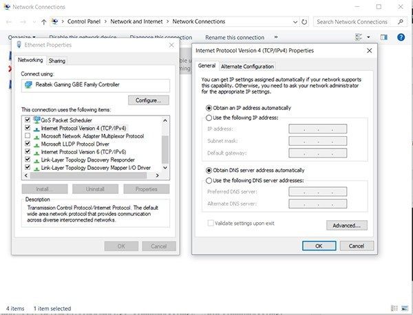 Если у вас по-прежнему возникают проблемы с драйвером после цикла, описанного выше, вернитесь к окну сетевых подключений, которое мы ввели выше. Щелкните правой кнопкой мыши свой драйвер Ethernet и выберите «Свойства» в контекстном раскрывающемся меню. Это загрузит список предпочтений и свойств вашего сетевого адаптера. В этом списке найдите «Протокол Интернета версии 4», щелкните его и выберите поле «Свойства» под списком. Большинство пользователей обнаружат, что «Получить IP-адрес автоматически» выбрано по умолчанию. Вместо того, чтобы оставлять это активным, выберите другой вариант и введите тот же IP-адрес, который указан в настройках командной строки выше. Установите маску подсети 255.255.255.0 и скопируйте номера шлюза по умолчанию вниз (обычно 192.168.x.x, где x представляет некоторую вариацию 0 и 1) и сохраните ваши предпочтения. Закройте панель управления и повторно проверьте подключение к Интернету.