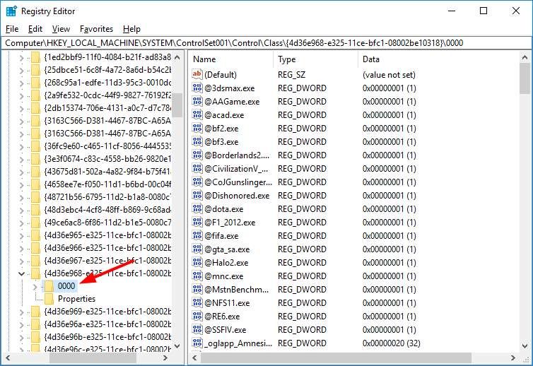 б) В редакторе реестра используйте куст реестра с левой стороны, чтобы перейти к местоположению «HKEY_LOCAL_MACHINE \ SYSTEM \ ControlSet001 \ Control \ Class \ {4d36e968-E325-11CE-BFC1-08002BE10318} \ 0000» ИЛИ ЖЕ «HKEY_LOCAL_MACHINE \ SYSTEM \ ControlSet001 \ Control \ Class \ {4d36e968-E325-11CE-BFC1-08002BE10318} \ 0001«.