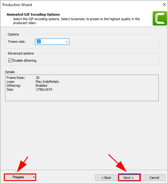 10) Проверьте параметры кодирования (вы можете оставить его по умолчанию), затем нажмите следующий. Вы можете нажать предварительный просмотр для просмотра вашего GIF.