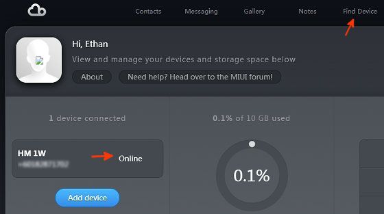 - На Mi Cloud домашняя страница, убедитесь, что ваш телефон появляется онлайн, затем нажмите Найти устройство.