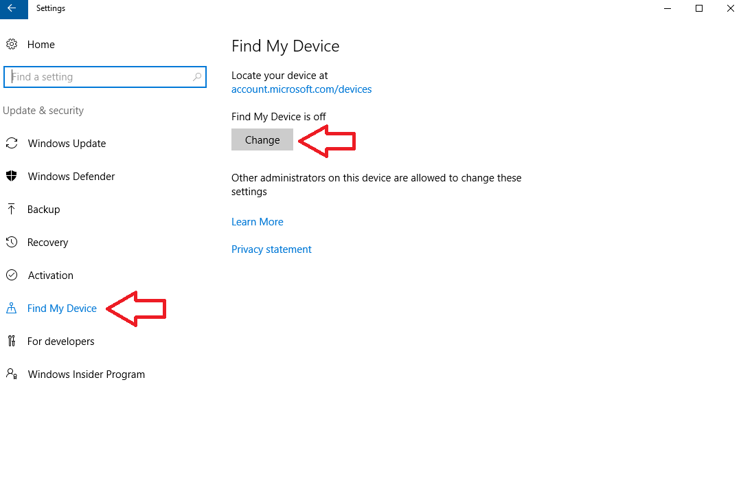 Оттуда, перейдите к Обновить Безопасность а затем нажмите на Найти мое устройство Вкладка.