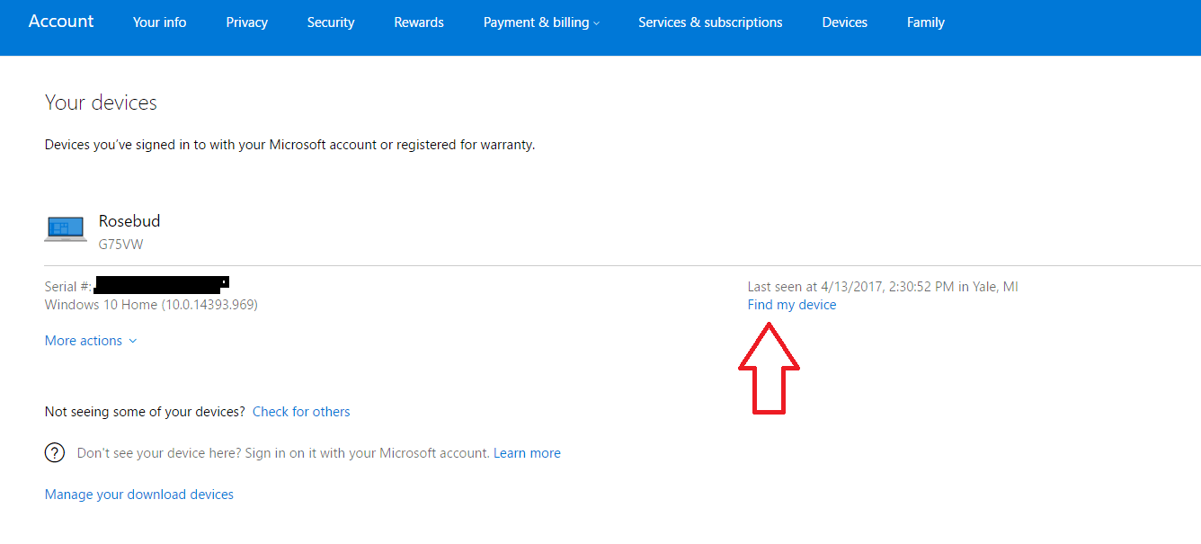 Под этим устройством будет показан серийный номер, а также версия для Windows 10, на которой оно установлено. А справа он показывает вам последний раз, дату, город и штат, в котором он был замечен. Нажав на ссылку «Найти мое устройство», вы попадете на карту, где вы можете попытаться определить местоположение вашего устройства.