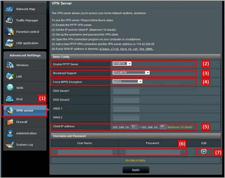 Например, для маршрутизатора ASUS необходимо настроить сервер VPN в Расширенные настройки. Затем выберите тип Поддержка вещания а также Принудительное шифрование MPPE, введите диапазон IP-адресов для VPN-клиентов и введите свое имя пользователя и пароль для VPN-клиентов.