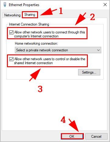 - Нажмите на разделение и установите флажок рядом с Разрешить другим пользователям сети подключаться к Интернету через этот компьютер, а также Разрешить другим пользователям сети контролировать или отключать общее подключение к Интернету. Затем нажмите Хорошо.