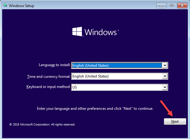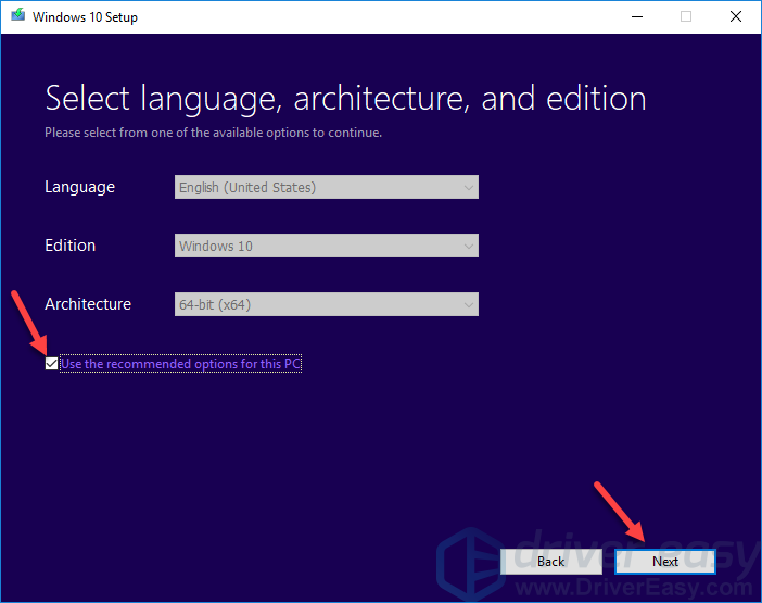 - Нажмите следующий если вы согласны использовать рекомендуемые варианты. Если вы хотите изменить параметр, снимите флажок Использовать рекомендуемые параметры для этого ПК, затем установите предпочтительные параметры и нажмите Далее, чтобы продолжить.