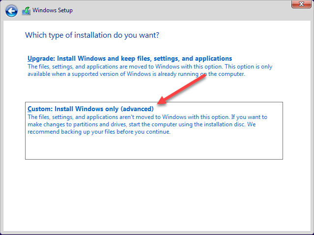 - Нажмите Пользовательский: установить только Windows (дополнительно).