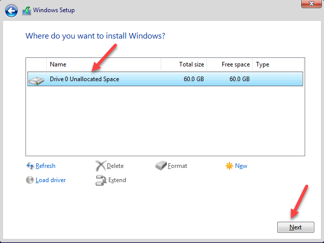 - Выберите диск, на который вы планируете установить систему. Затем нажмите следующий.