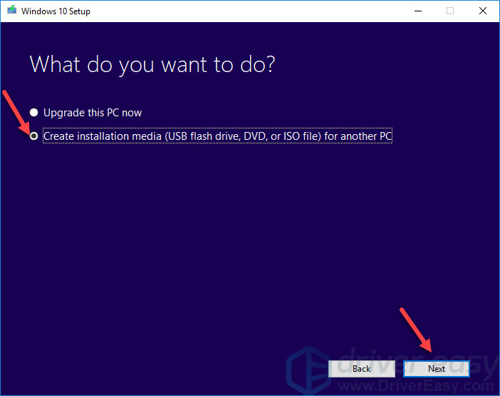 - Затем вы увидите страницу Что вы хотите сделать. Выбрать Создайте установочный носитель (USB-накопитель, DVD или файл ISO) для другого компьютера..
