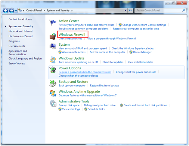1) Перейти к Панель управления > Система и безопасность > Брандмауэр Windows.