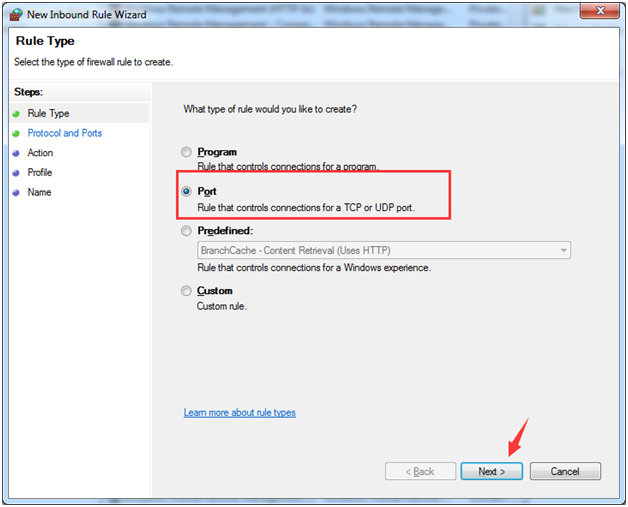 5) Выберите порт как новое правило. Затем нажмите Следующий.