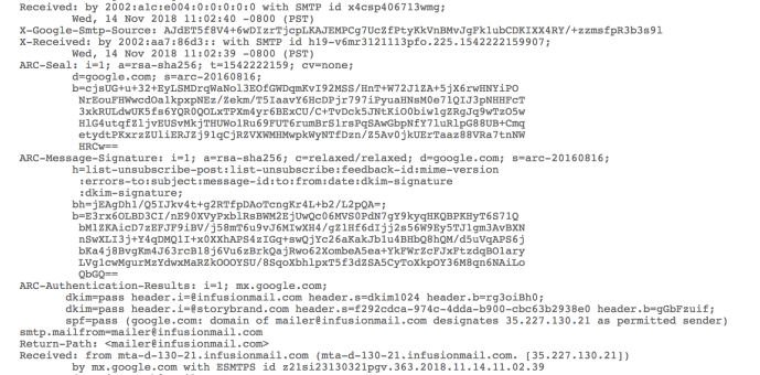 Чтобы просмотреть метаданные для любого электронного письма в Gmail, щелкните три точки в верхнем правом углу электронного письма. Затем нажмите «Показать оригинал». Как видно из скриншота ниже, метаданные будут отображать правильную дату и время для каждой остановки, которую электронная почта делает на пути к получателю.