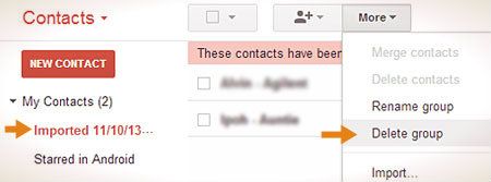 - В целях ведения домашнего хозяйства хорошо удалить группу [Импортировано + ДД / ММ / ГГГГ]. Итак, нажмите на название группы, перейдите к Больше > Удалить группу.