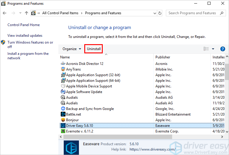 3) Выберите приложение Вы хотите удалить и нажмите Удалить (Для некоторых приложений это может быть удаление / изменение). Если вы не уверены, какое приложение вы можете удалить, отсортируйте приложения по размеру от наибольшего до наименьшего, а затем выберите приложения, которые вы можете удалить.
