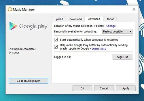 На вкладке About нет ничего интересного, кроме некоторых кредитов, наряду с условиями обслуживания и ссылками на конфиденциальность. Это вкладка Advanced, на которую мы хотим обратить пристальное внимание. Отсюда вы можете изменить местоположение своей музыкальной коллекции между теми же папками и опциями, которые мы упоминали выше. Вы также можете установить или снять флажок автоматического запуска Music Manager при загрузке компьютера, а также включить или отключить автоматические отчеты о сбоях, отправляемые в Google. Но самая важная функция здесь охватывает проблему пропускной способности, о которой мы упоминали выше. По умолчанию Google Play Music Manager поддерживает максимально быстрый уровень загрузки, но если вы беспокоитесь о своей скорости или использовании данных, вы можете изменить свою скорость между 1 Мбит / с или даже ниже. Очевидно, что установка Music Manager на такие низкие скорости означает, что ваша загрузка займет значительно больше времени, но это поможет вам управлять вашим интернет-соединением, находясь в середине загрузки.