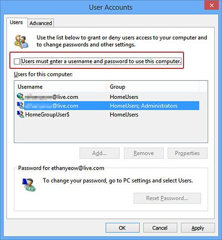 - На Учетные записи пользователей выберите свое имя пользователя и снимите флажок Пользователь должен ввести имя пользователя и пароль, чтобы использовать этот компьютер.