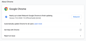 Для этого нажмите Chrome в верхнем левом углу экрана. Затем выберите «О Chrome». По состоянию на конец 2018 года Chrome до версии 71. Пока ваш браузер Chrome обновлен, при выборе «О Chrome» он будет уведомлять вас о том, что вы используете наиболее текущая версия Chrome доступна. В противном случае, нажмите на кнопку, чтобы получать обновления, когда предоставляется опция.