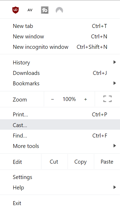 - Нажмите на кнопку меню в Chrome, затем выберите Cast из выпадающего меню.