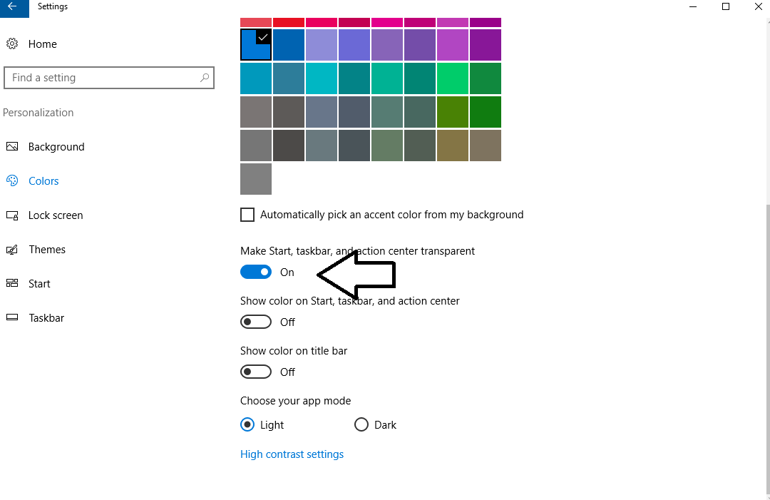 Чтобы включить прозрачность, просто зайдите в Настройки> Персонализация> Цвета. Отсюда вы сможете поставить галочку для включения или выключения прозрачности (см. Изображение выше). И, если вы выпадаете из категории панели задач, вы можете выбрать другой сплошной цвет для панели задач, отличный от значения по умолчанию.