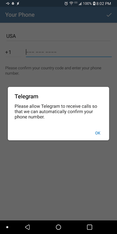 Когда вы регистрируетесь в Telegram, вы должны дать приложению разрешение совершать и принимать вызовы на свой телефон, а также давать приложению свой номер телефона. Это, конечно, огромная проблема конфиденциальности; если кто-то получает доступ к серверу Telegram, ваша личность подвергается риску. К сожалению, если вы хотите зарегистрироваться в Telegram на своем основном телефоне, вам придется отказаться от этой информации. Однако Telegram не использует этот номер для связи с вами и не передает номер другим пользователям. Имя пользователя в вашей учетной записи становится идентифицирующим токеном для службы.