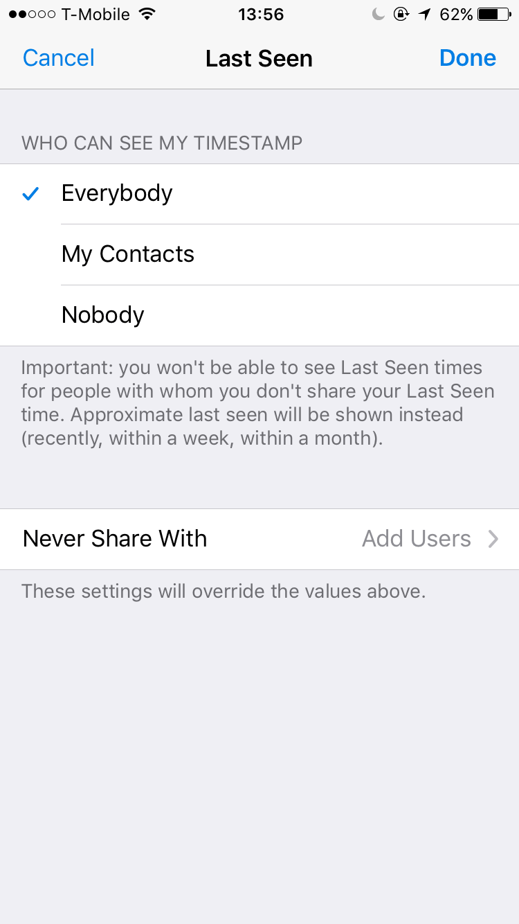 - Выберите «Все», «Мои контакты» или «Никто». Вы также можете установить исключения. Это позволяет добавить контакт, который всегда будет исключен из последнего увиденного уведомителя.