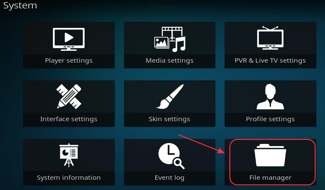 1) Откройте Kodi и нажмите настройки > Файловый менеджер.