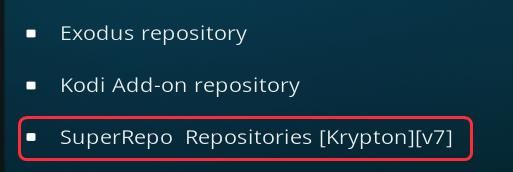 12) Нажмите SuperRepo Репозитории [Криптон (это должно быть название версии вашего Kodi, которое вы только что выбрали)].
