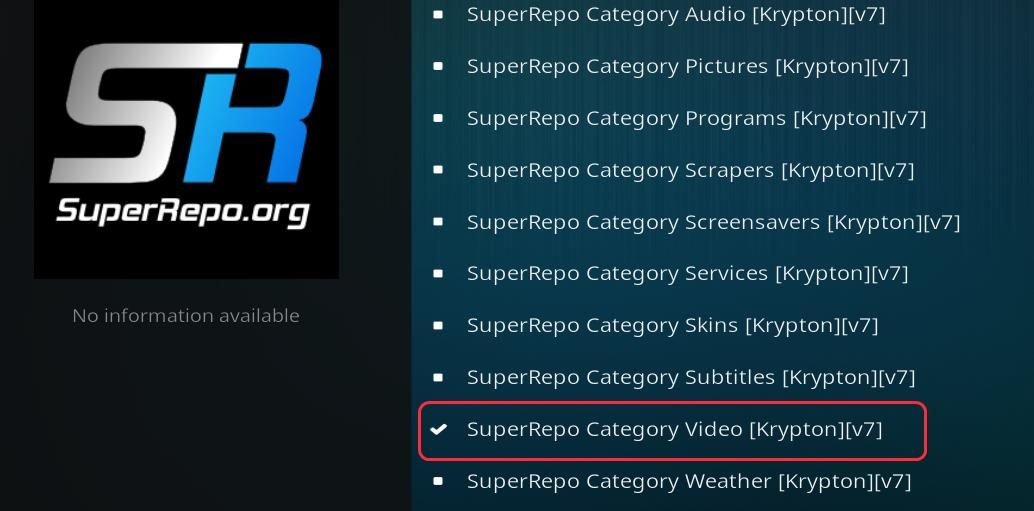 13) Выберите Репозиторий дополнений> Видео категории SuperRepo [Krypton (это должно быть название версии вашего Kodi, которое вы только что выбрали)].