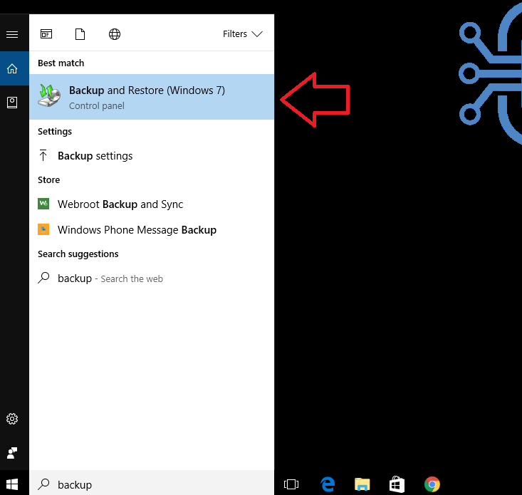 Затем откройте меню «Пуск» и в поле «Поиск» введите Резервное копирование и восстановление (Windows 7). Вы хотите выбрать Резервное копирование и восстановление (Windows 7) запрограммируйте панель управления, как показано выше.