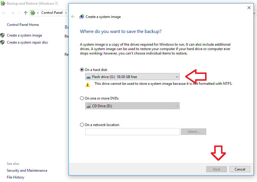 Когда вы создаете образ системы, вы действительно создаете его для резервного копирования вашего ПК на случай, если с ним что-нибудь случится. Если вы оставите его на том же диске, что и ваша операционная система, и этот диск выйдет из строя или умрет, вы вообще не сможете получить доступ к этому образу системы. Вот почему вам нужен внешний источник. Итак, как только файл образа будет готов к работе, убедитесь, что у вас есть другое место для его установки — еще один жесткий диск, большая флешка и т. Д. Фактически, чтобы даже создать образ системы, вам нужен еще один диск для его сохранения на , как вы не можете сохранить его на тот же жесткий диск.