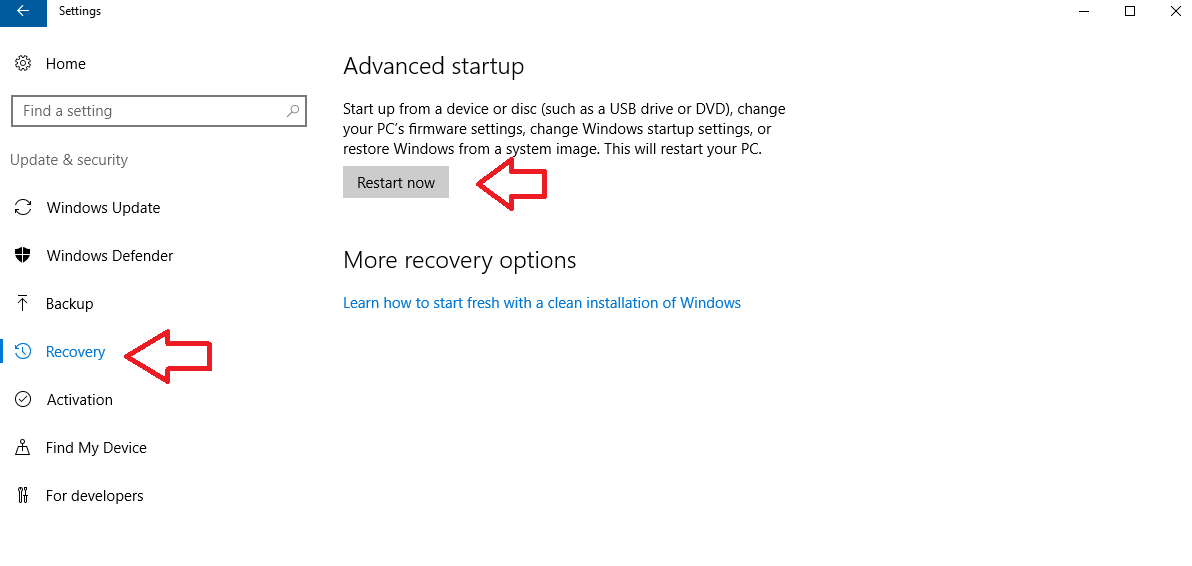 Microsoft в Windows 10 позволяет легко восстановить с помощью образа системы, подобного этому. Если вы можете загрузиться в Windows 10, вы можете просто открыть меню настроек, перейдите в Обновить Безопасность а затем под восстановление На вкладке левой панели навигации должна быть кнопка «Перезагрузить сейчас», которая позволяет запускать с флэш-накопителя или с диска для восстановления системы, который мы создали ранее.