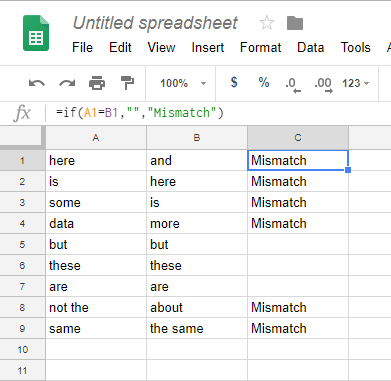 - Вставьте if = if (A1 = B1, «», «Mismatch») в ячейку C1. Таким образом, если A1 и B1 одинаковы, формула возвращает пустую строку, а если они не совпадают, возвращает «Несоответствие».