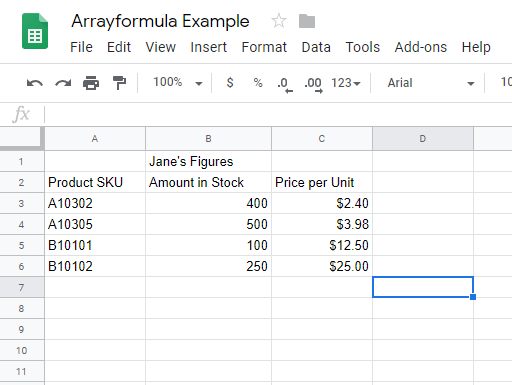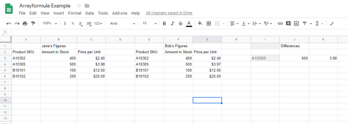 Если мы хотим проверить, совпадают ли цифры цены за единицу, сообщенные Джейн и Бобом, мы можем использовать ARRAYFORMULA, чтобы сделать это. Мы хотим сообщить о любых различиях и распечатать их, начиная с ячейки I3, поэтому в I3 мы вводим следующую формулу: