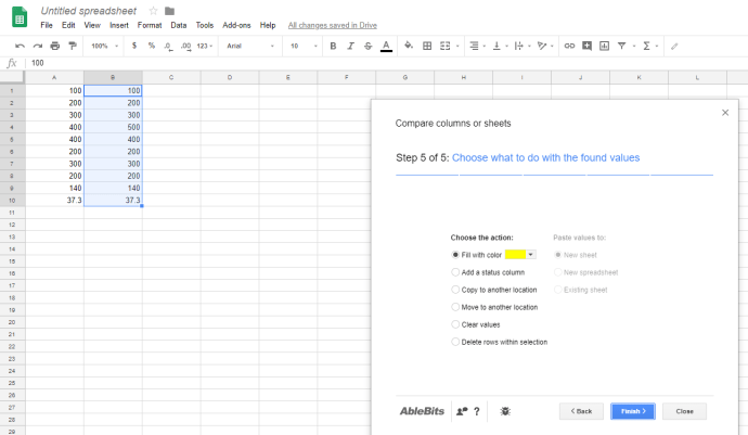 - Выберите, как вы хотите, чтобы электроинструменты показывали результаты сравнения. Вы можете выбрать цвет в дубликатах или уникальных ячейках, чтобы переместить или скопировать данные в новые столбцы, и другие варианты.