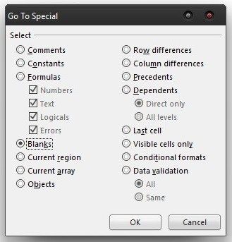 - Нажмите OK (этот выбор обеспечит выбор всех пустых ячеек в заданном диапазоне)