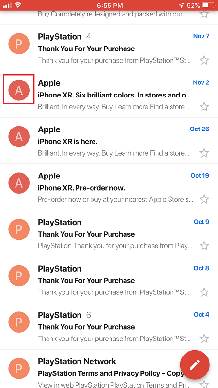 - В списке электронных писем нажмите на круглую миниатюру, представляющую профиль пользователя. Это превратит миниатюры в флажки.