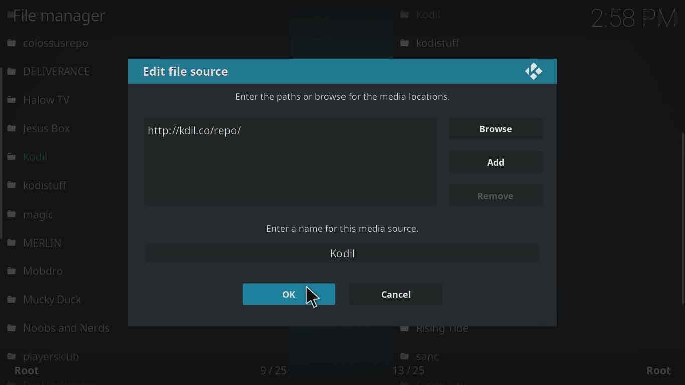 - Двойной клик по Добавить источник и выбрать . Введите (или скопируйте / вставьте) следующий URL kodivpn.co/repo/kodil.zip. Назовите источник информации «Кодил».
