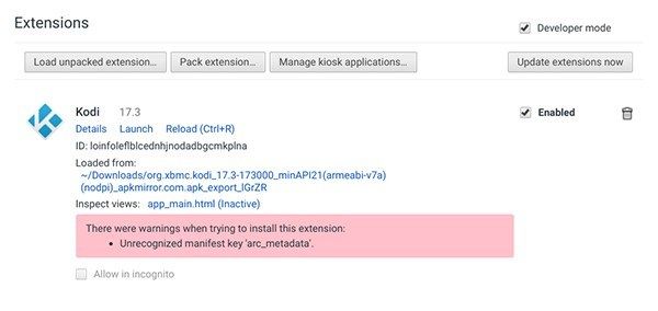 С проверенным режимом разработчика найдите кнопку «Загрузить распакованные расширения» в левом верхнем углу страницы, внизу страницы, где написано «Расширения». Нажмите эту кнопку, чтобы активировать опцию, чтобы начать поддержку ваших расширений. У вас откроется приглашение в вашем файловом браузере. Перейдите в папку «Загрузки» в браузере файлов для Chrome и найдите файл ARC Welder KODI.apk_export, созданный при настройке приложения на предыдущих этапах. Нажмите кнопку «Открыть» в нижней части проводника, и вы увидите расширение, добавленное в Chrome OS. Появится розовое окно с предупреждением о расширении, предупреждающее вас о состоянии расширений для разработки и возможных проблемах и проблемах безопасности, возникающих при этом. В этом случае это поле можно безопасно проигнорировать, и у вас будет расширение Kodi в Chrome, позволяющее быстро добавлять и запускать приложение прямо из браузера.