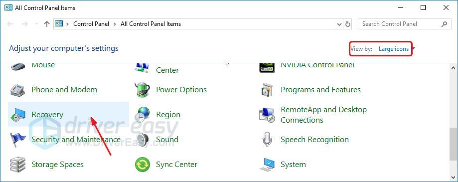 - Нажмите восстановление когда Просмотр по большим иконкам выбран.